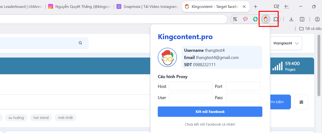 Rồi bạn điền 4 thông số vào Kingcontent Extension, nhấn KẾT NỐI FACEBOOK