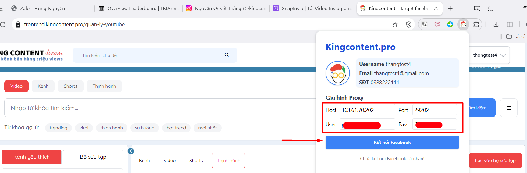 Đầu tiên, hãy đặt cấu hình Proxy cho tài khoản Facebook của bạn. Bạn có thể bỏ qua bước này nhưng HÃY CHỊU KHÓ ĐIỀN THÔNG SỐ PROXY, chỉ mất 5 giây rất đơn giản. Nếu không có Proxy, bạn sẽ phải dùng chung địa chỉ IP với những khách hàng đang sử dụng Kingcontent. Hiểu đơn giản là 1000 người đang dùng chung Facebook ở một căn phòng.