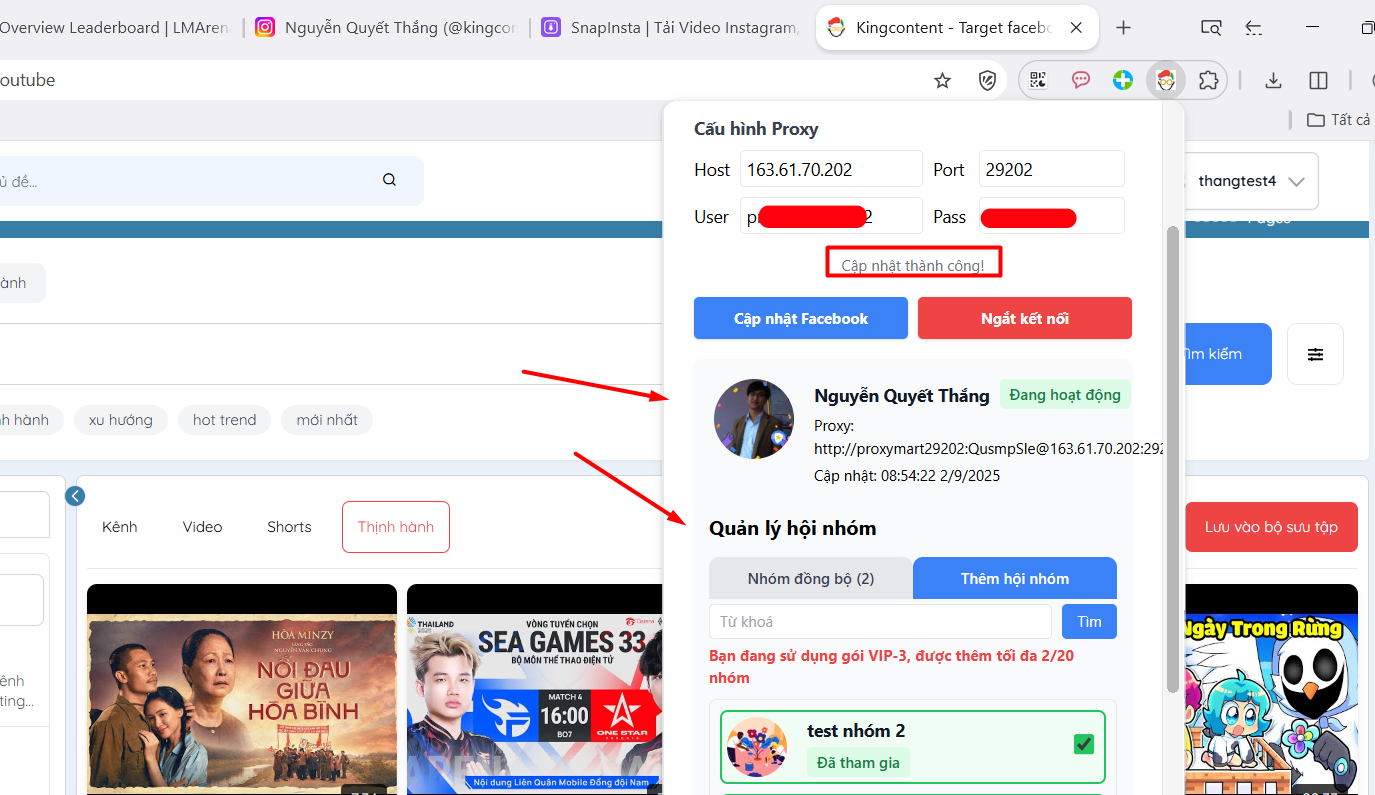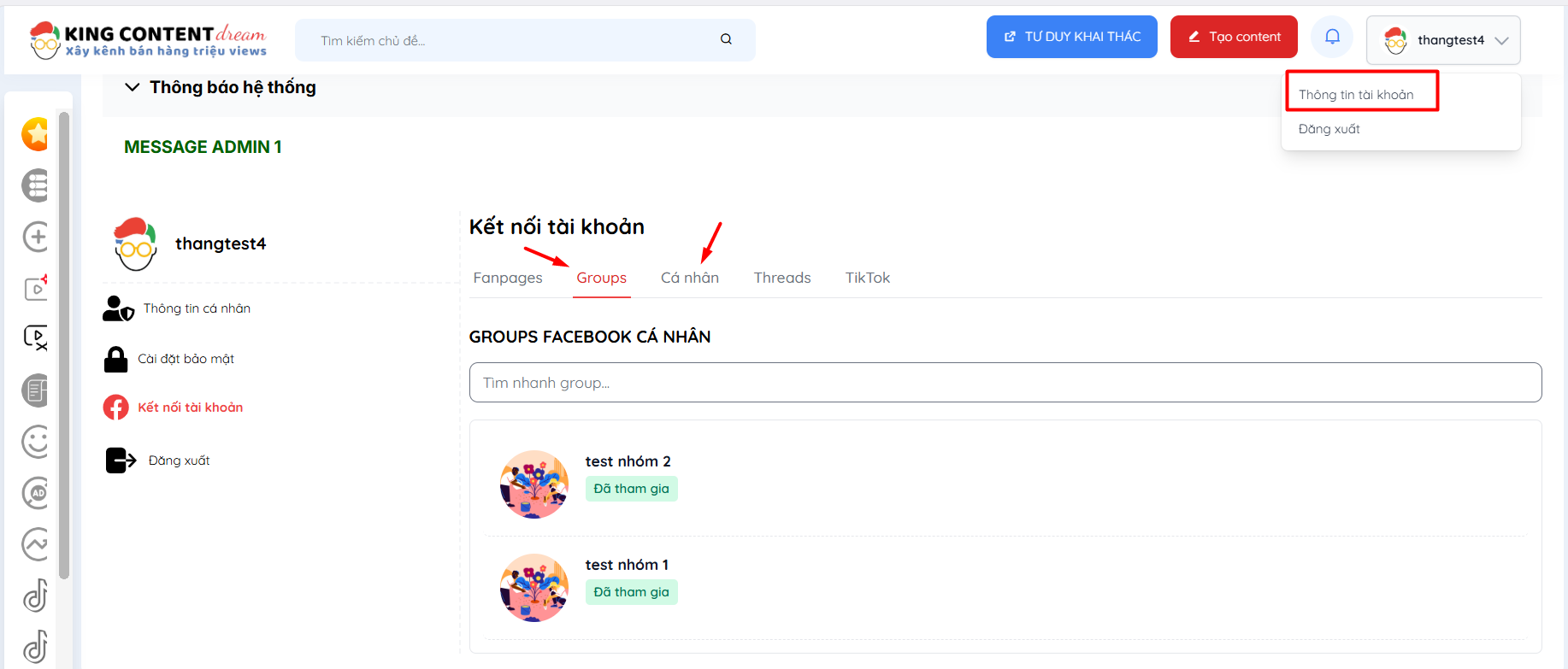 Bây giờ bạn quay lại Kingcontent sẽ thấy danh sách Facebook cá nhân và hội nhóm hiển thị: