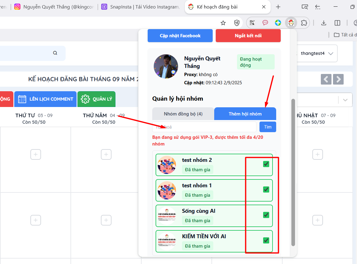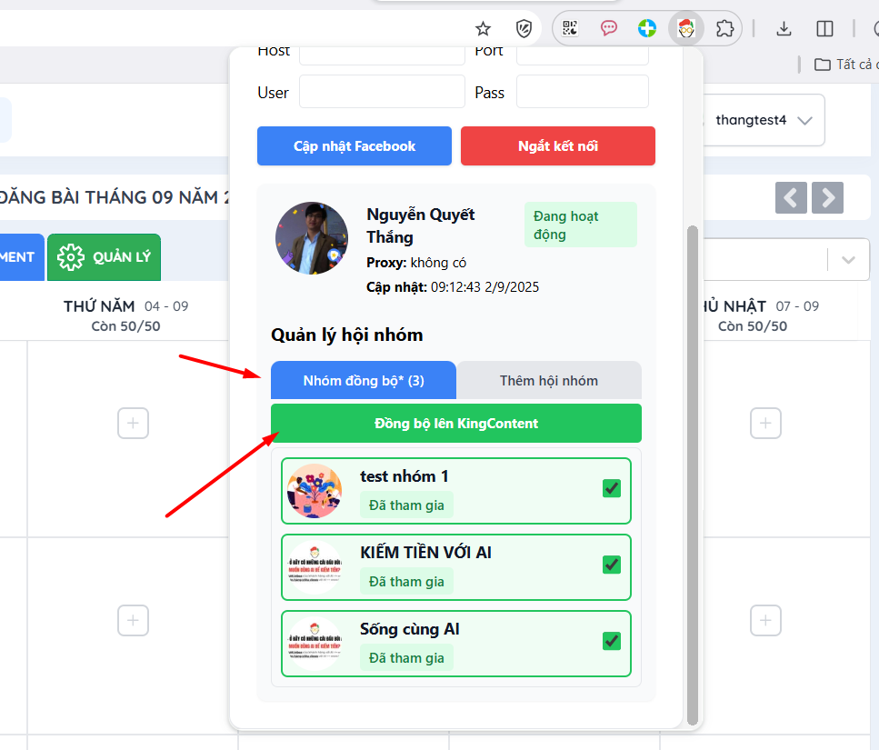 Facebook cá nhân của bạn sẽ tự cập nhật về trang chủ Kingcontent.pro, riêng danh sách hội nhóm chỉ cần nhấn vào tab THÊM HỘI NHÓM, tìm các nhóm bạn đang quản lý hoặc đang tham gia, tick chọn các nhóm này: