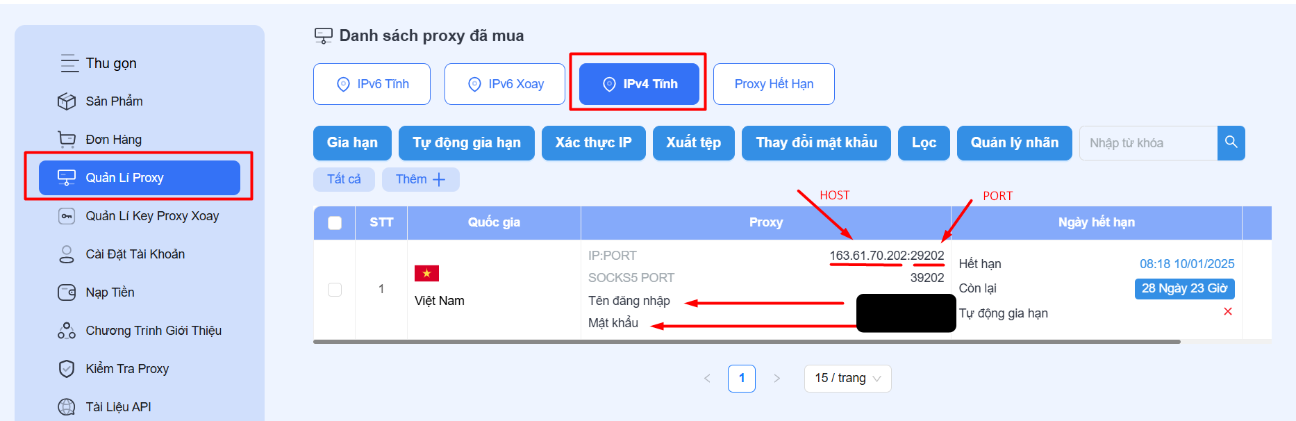 Sau khi mua thành công Proxy, lấy ra 4 thông số này: Host – Port – Tên đăng nhập – Mật khẩu. Ví dụ hình dưới, Host là dòng 163.61.70.202 , còn Port là dòng 29202 (phía sau dấu hai chấm)