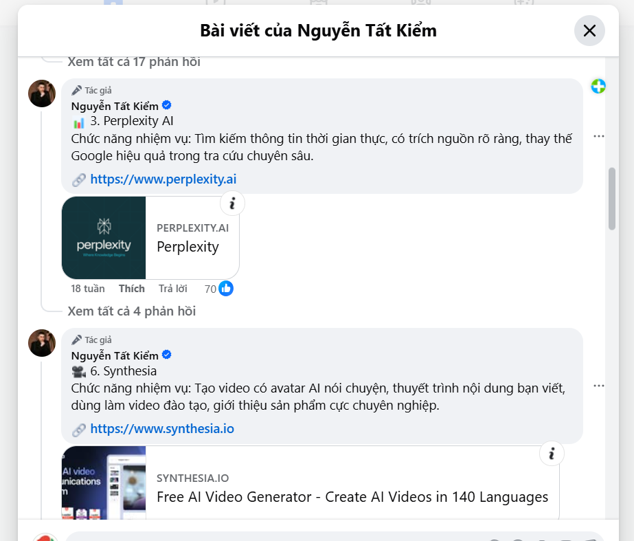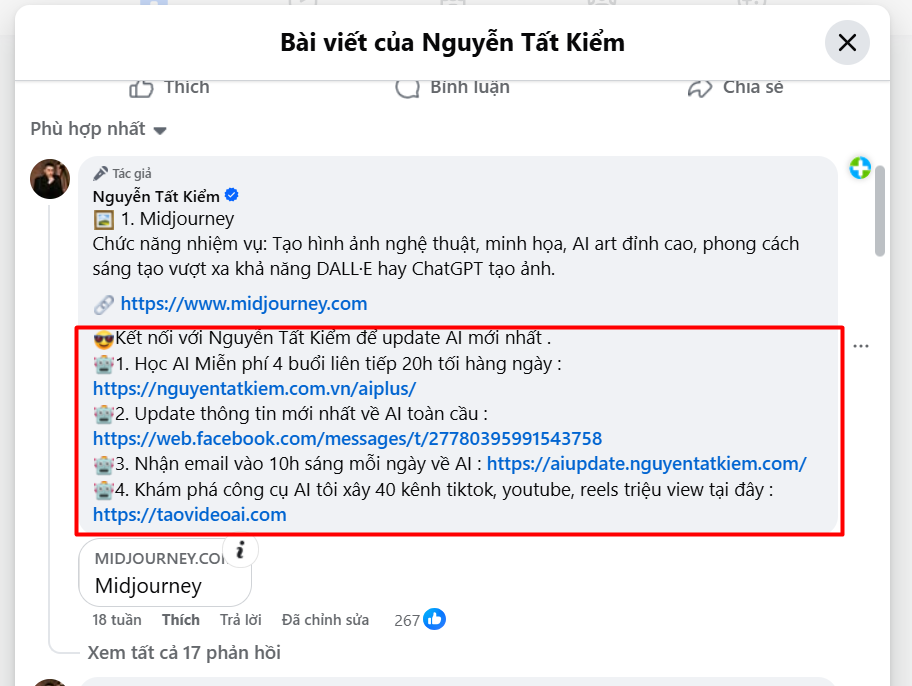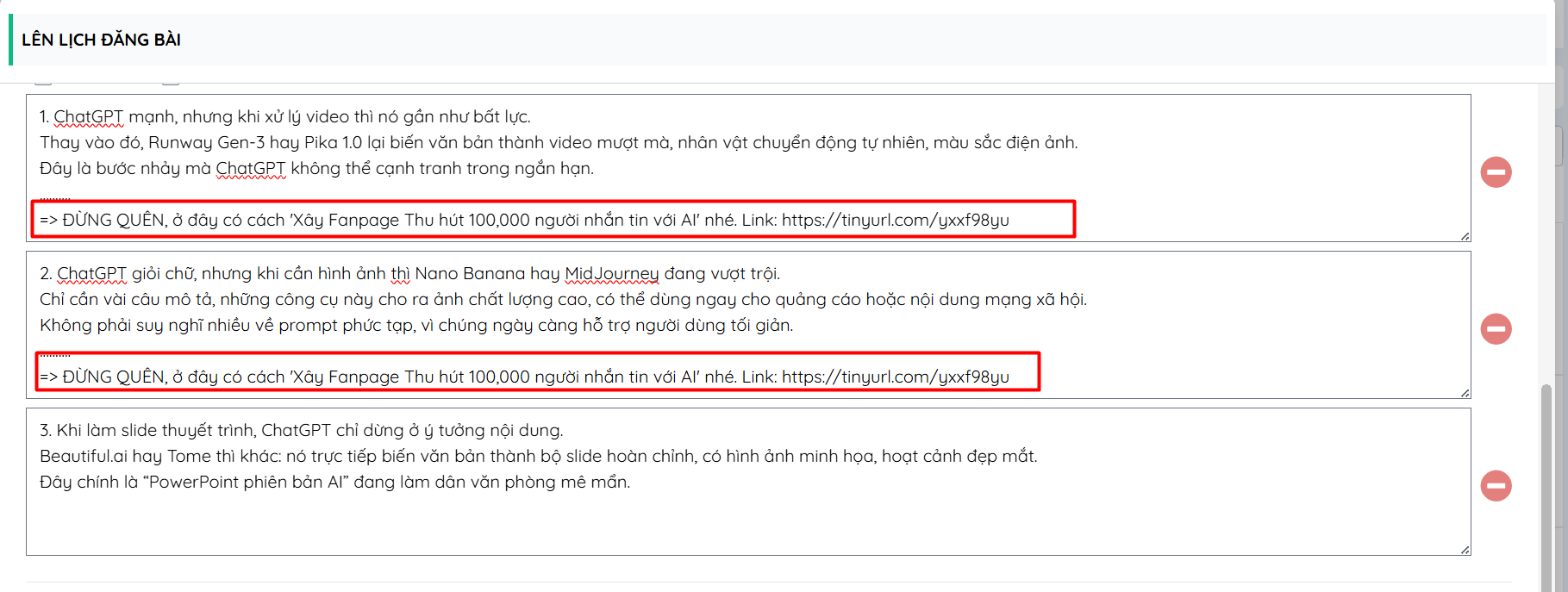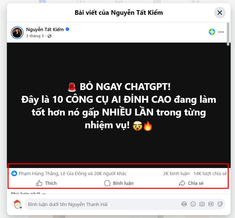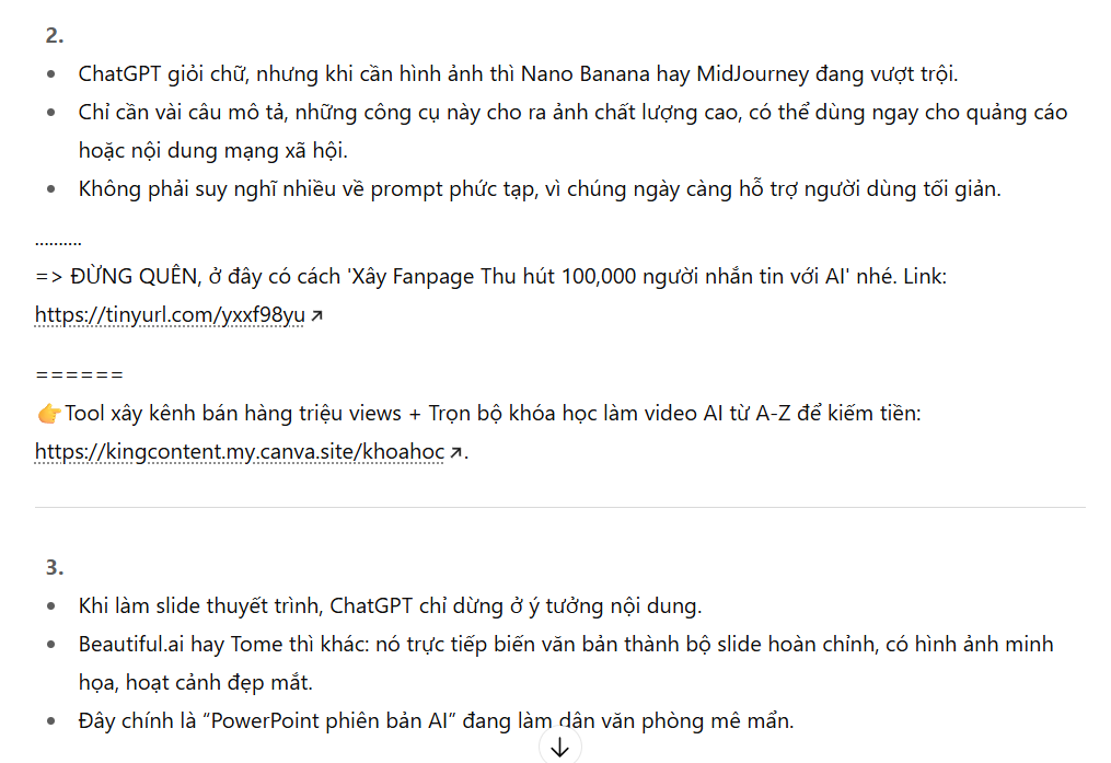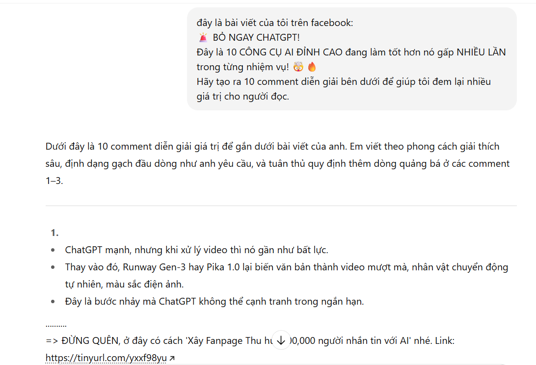 Rồi copy từng phần diễn giải mà ChatGPT đã gợi ý, mỗi diễn giải là 1 ô bình luận riêng, bạn được phép tạo tối đa tới 10 lần bình luận. HÃY ĐÍNH KÈM LINK SẢN PHẨM, DỊCH VỤ, LINK TIẾP THỊ LIÊN KẾT VÀO ĐỂ TĂNG CHUYỂN ĐỔI NHÉ: