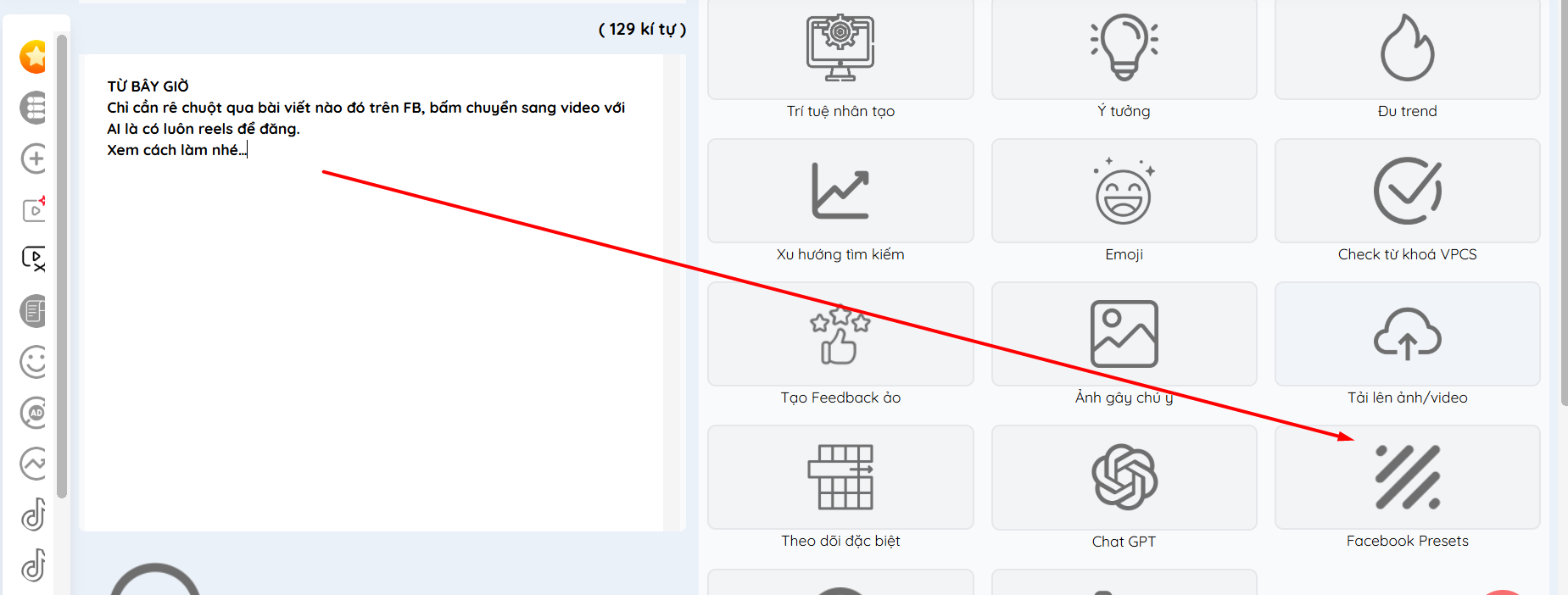 Soạn nội dung, rồi bấm vào chức năng FACEBOOK PRESETS