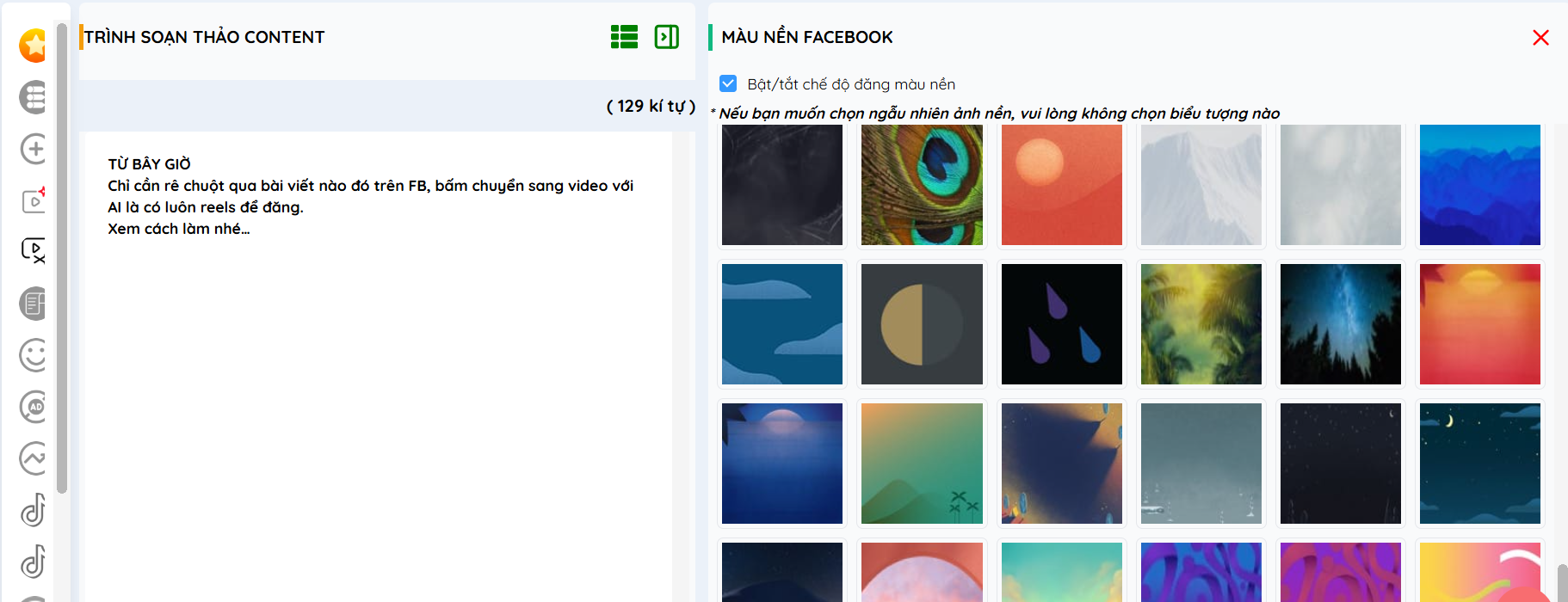 Chọn ra một mẫu nền bạn thích, trong này có tới 354 mẫu cực kì phong phú và GÂY CHÚ Ý CỰC MẠNH, giúp người xem Facebook phải dừng lại để xem bạn đang viết gì, trong khi chức năng đăng bài trực tiếp trên Facebook chỉ giới hạn rất ít mẫu nhé. Nếu muốn chọn ngẫu nhiên, vui lòng đừng click vào biểu tượng nào, Kingcontent.pro sẽ chọn ngẫu nhiên mỗi hình khác nhau cho mỗi lần đăng:
